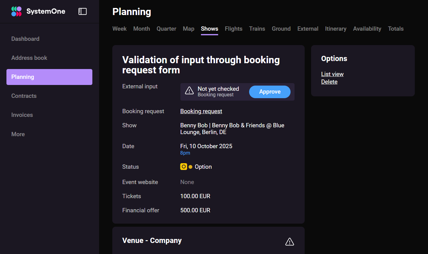 Your agency or artists can embed your SystemOne booking request form on their website. These requests show up directly in SystemOne, where you can attend to them. We've updated the page where you review incoming requests—it’s now easier to read and faster to work with.