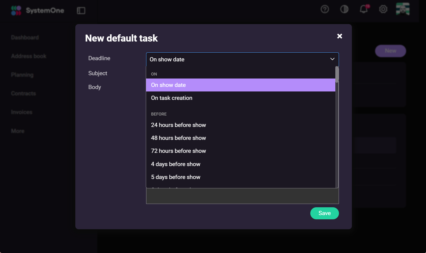 You can manage default tasks in system settings in a dedicated admin module. For each task, you can define the deadline relative to the show date, for example, 14 days before or 2 days after the show.